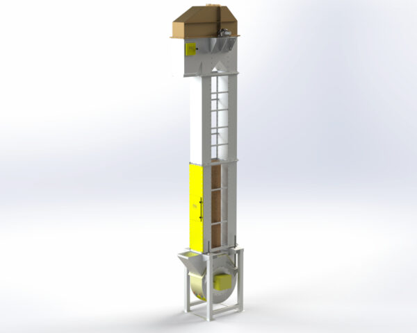 O transportador denominado elevador de canecas, é um equipamento que tem a finalidade de elevar matérias primas ou produtos acababados, a uma altura suficiente, para despejá-los em algum ponto pré-determinado através das tubulações. É composto de uma correia ou corrente sem-fim, onde se fixam as caçambas ou canecas uniformemente espaçadas, que se movimenta numa direção vertical, ou quase, sobre duas polias ou rodas dentadas uma superior e outra inferior.